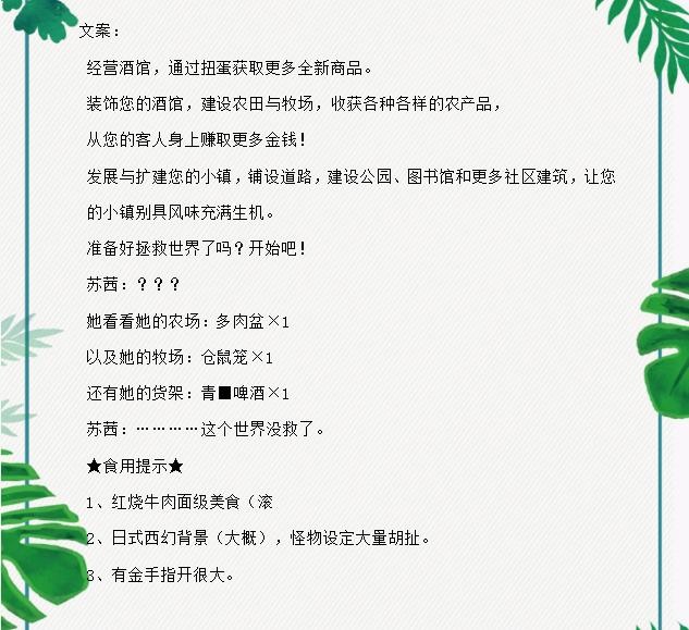 小w书评:类似网游基建文,西幻爆肝经营酒馆,有系统。女主穿越异界荒无人烟亡灵峡谷,招兵买马,重建大峡谷,并揭开多年前峡谷消亡的秘密。女主性格普通,男主是多年前大神,文笔轻松幽默,各类小动物可爱灵动,一直贡献笑点。综合部分剧情太意识流交代不清,以及感情线bug,三星,文荒看。