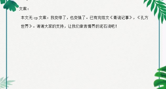 小w书评:荆棘包含下面两篇都是无cp,女主非人,槐树妖成人捉鬼挣钱基建山庄。没有明确主线,日常刷剧情,轻松幽默。女主脑洞破天,有一套诡异的自我世界观,吃货爱钱。有两个女主精气化成的娃,人小鬼大,套路女主太可乐了。到了后期审美疲劳,剧情没有新意,但是考虑到全文70%沙雕,还是给五星好评。(基建山庄内容较少)