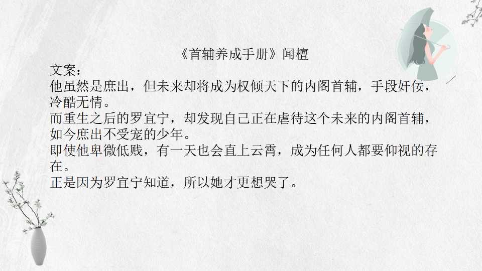 《首辅养成手册》当年非常火的一本小说,此本之后,冒出一堆首辅类型文。非女强文,女主重生,知道庶出哥哥是未来大boss果断抱大腿的故事,前期男女主互动还是很甜的,前夫大都督入场后全文开始虐恋情深走向,看的非常舒坦。虽然男一男二撞了强大深情专一的人设,无奈吃这种人设,看的很开心,喜欢大女主文的朋友慎入。