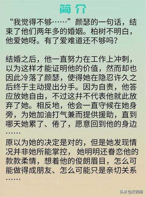 短评:这部小说超级宠,女主先婚后爱,男主对女主一见钟情,女主一开始喜欢的是男主的弟弟,但弟弟把她让给了自己的哥哥,女主赌气跟男主结婚。但婚后男主虽然对女主很好,却用错了爱人的方式,导致女主提出分手。离婚后两人反而做起了好朋友,在用朋友的关系相处后女主反而慢慢感受男主的好,渐渐明白自己对男主的感情。