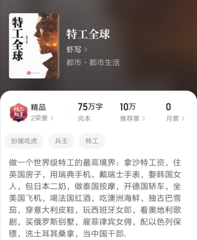 虾写,这一位是起点五级作者,共有十四部作品,累积字数1959万。今天给大家推荐的,是他的五本获得精品成就的都市小说。
