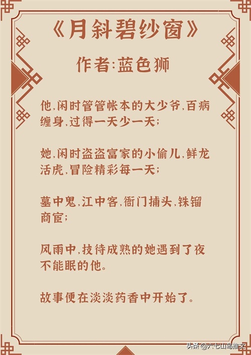 女主是一个飞贼,男主是身体不太好的商家公子,女主是去男主家偷东西的时候顺便救了男主一命,两人便结实了,男主人设十分温柔,对女主也特别保护,两个人之间没有误会和阻碍,平平淡淡地恋爱文,故事古风味浓。