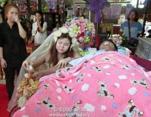 2016年1月5日泰国北柳府一26岁女子身披婚纱嫁已亡男友。