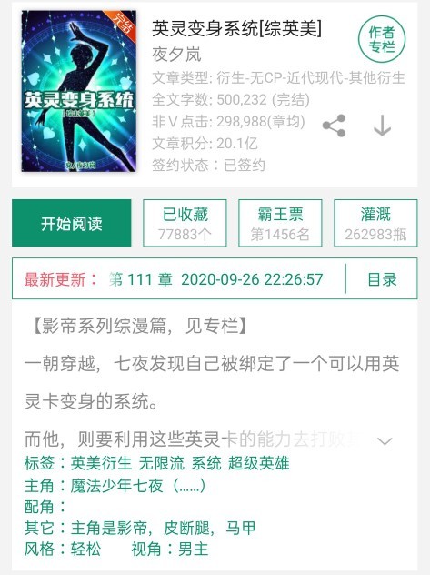 ps:说到综英美小说,我就想起了我之前在别的软件推文中提到过的《变身英灵系统[综英美]》这是一篇无CP马甲文系列文,非常的OK。第二部是综漫推文。