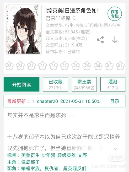 这篇文章除了综英美外,还有一些文野相关,主角是文野世界原创人物,各个方面都不错,就是和上篇推文一样,更新比较慢,没什么大问题。顺带一提女主姓津岛,所以性格方面你们可以自行想象。