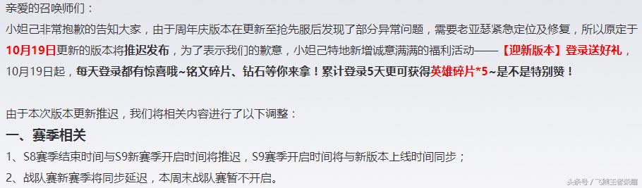 观众老爷们以为明天就更新段位和版本,正在准备努力不懈的在冲分中度过美好的星期三吗?那么就大错特错了,天美总是给人带来意想不到的惊喜,在临近19日的今天,官方让人来了个措手不及,告诉你延迟更新了!又多了四五天掉分时间,厉不厉害?