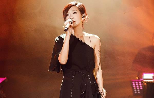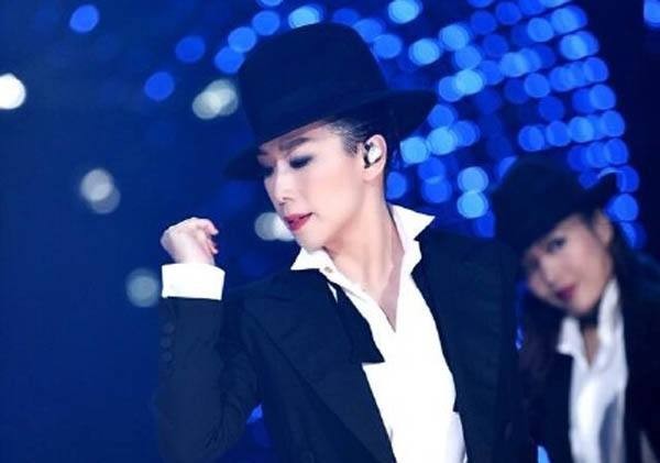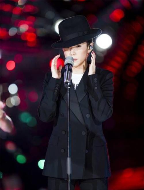 从现场的照片中我们能够看到当天林忆莲身穿黑色的小西服,到肩的头发是散开的。