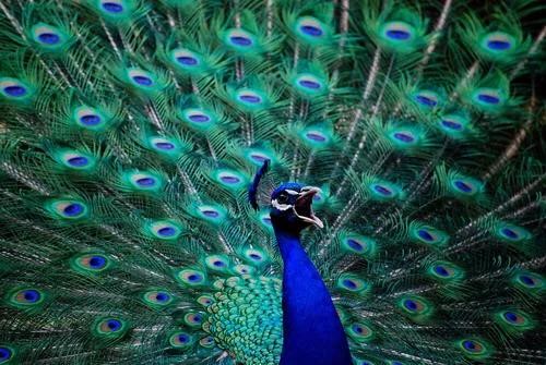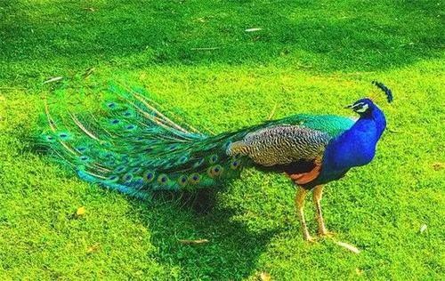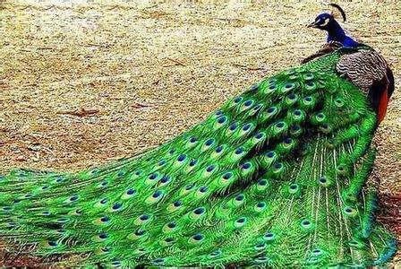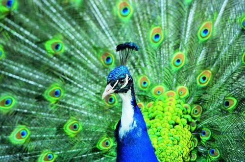 蓝孔雀又名印度孔雀,体长90-230厘米,翼长130-160厘米,体重4-6千克。雄鸟具有直立的枕冠,羽色华丽,颈部为宝蓝色,尾屏绿色,富有金属光泽。印度国鸟,伊朗两国鸟之一。