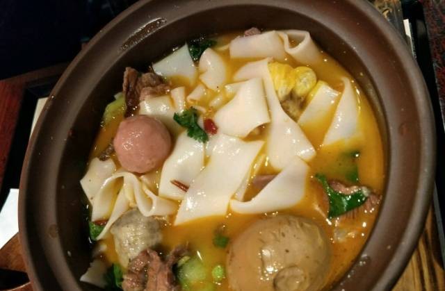 这一碗用紫砂碗砵呈上的红烧牛腩码特宽粉分量好生扎实,金黄的浓汤里,宽厚的米粉米香味还比较重。牛腩也扎实,超级入味,卤香味超级赞!