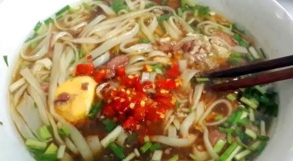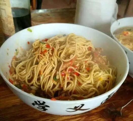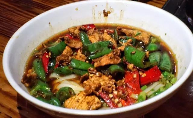 牛肉酱的很香,而且是大片牛肉,汤也很好喝,粉很滑,而且汤里加了很多碎芹菜叶,闻起来很香。辣椒炒肉连青椒都软烂入味,贪婪地将鲜嫩肉片送入口,鲜甜的肉香和汤底的香气此起彼伏,原来米粉也可以这么销魂。