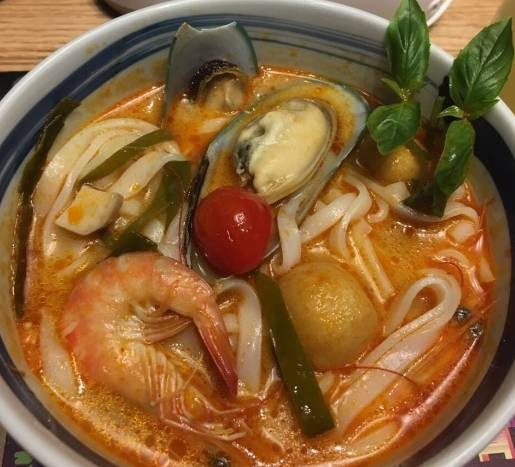 这个米粉比长沙常见的宽粉要稍厚一点点,口感顺滑。用厚瓷青花碗盛装的汤粉看似分量不多,大虾、青口、鱼丸等却是铺满了一层,橙红发亮的色泽看着让人食指大动啊~