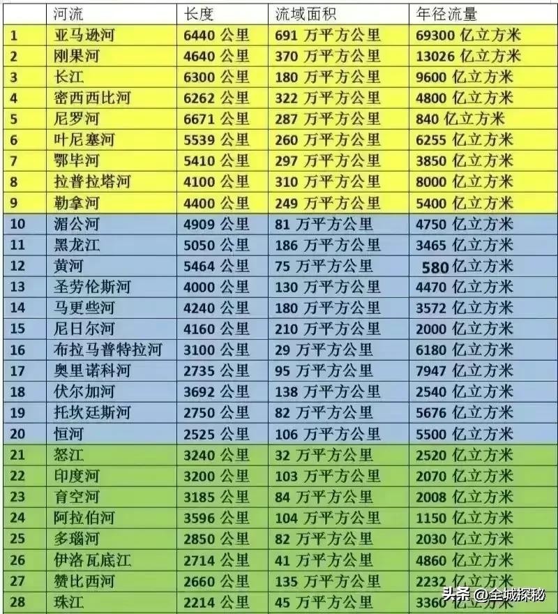 全球主要河流三大数据