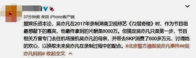 因为母亲同样参与他的演艺事务,节目组甚至不惜花600万来讨她的欢心。