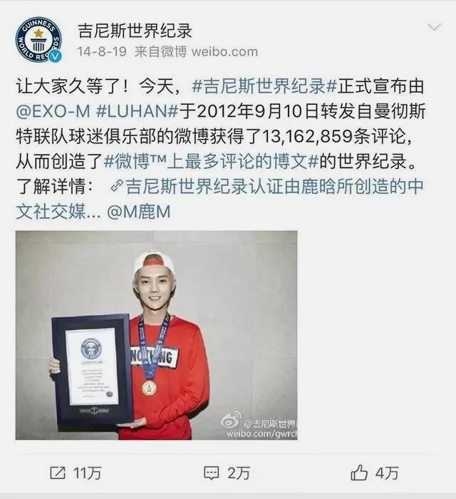 2014年8月19日,鹿晗在2012年9月10日转发的一条微博,获得了13163859条评论。