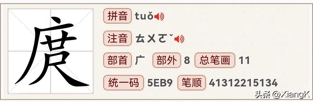 “庹”字的读音是【tuǒ】,这个字的部首是“广”,结构属于左右结构,总共有11个笔画。想象一下,用笔在纸上划出“庹”的笔顺,是不是感觉自己像个书法家了呢?