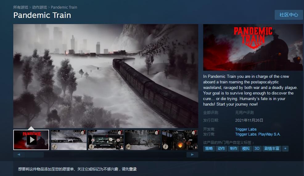 这款游戏叫做《Pandemic Train(瘟疫列车)》,是由一家叫做Trigger Labs的工作室打造的末日生存游戏模拟游戏,在游戏中玩家扮演的是一列火车上的工作人员,所处的世界遭到了瘟疫的侵袭,只能够在冰天雪地中一直行驶,保证自己的存活。