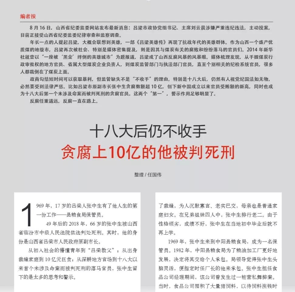 2014年5月,张中生的名字出现在了中央纪委监察部网站的调查名单上。这一消息,如石破天惊,打破了吕梁市的平静。调查结果显示,张中生利用职务之便,收受贿赂超过10.4亿余元。
