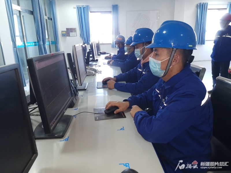 乌鲁木齐达坂城风力发电场华电达坂城西沟风电一场技术人员电脑监控风力发电运行情况。记者赵悦摄