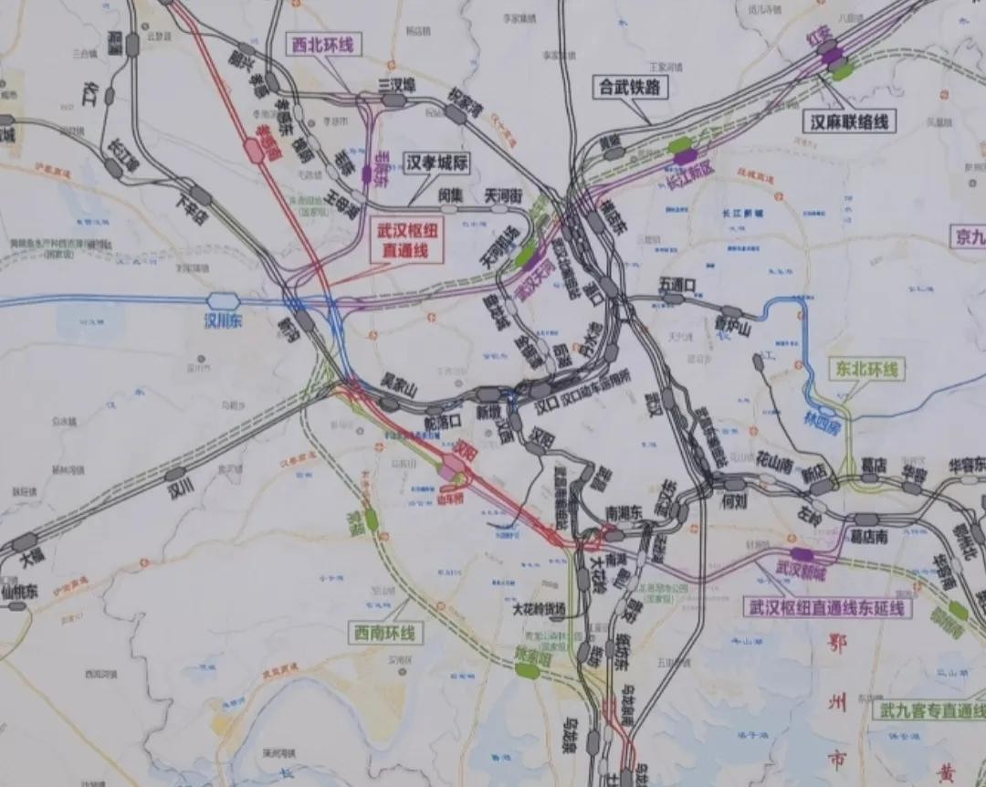 在可以预见的未来,武汉会有京广、京九、沪汉蓉、西武等高铁,以及汉孝、武咸、武冈等城际铁路通过。但它存在很明显的问题。首先就是各线路之间彼此不互通。比如,京广高铁与沿江高铁不互通,京广高铁经过武汉站,沿江高铁经过天河站、长江新区站,这一横一纵的两条高铁,无法实现直接互通。虽然京广高铁到了武汉站以后,可以通过连接线进入汉口站或转入天河站实现间接互通,但这样耗时间或换向跨线的布置,使得通行效率大打折扣。两条高铁无法直接换乘,造成旅客极为不便。