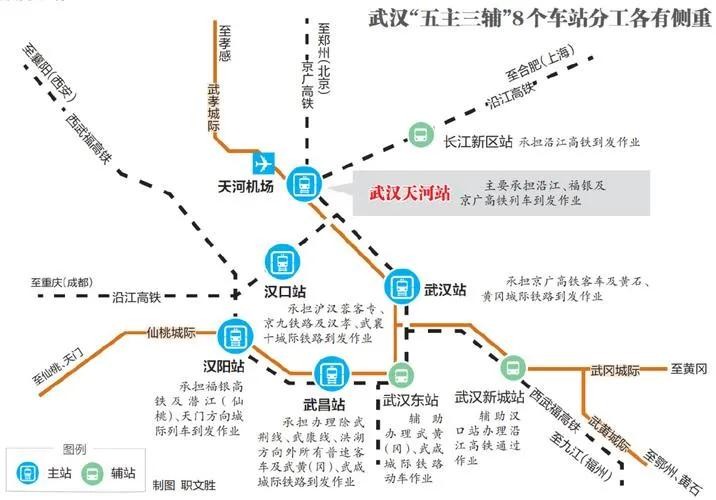 武汉铁路枢纽规划中有四主两辅或五主三辅的说法。目前四个主要高铁站分别是武汉站、汉口站、武昌站和武汉东站。