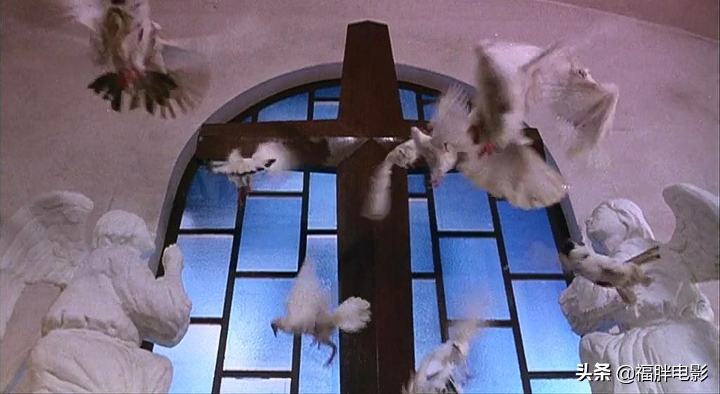十八、在何金银的幻想中,被阿丽枪击,血浆横飞、白鸽起舞。这是对吴宇森的英雄片的戏仿。