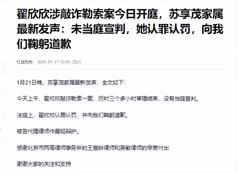 红星新闻——翟欣欣涉敲诈勒索案今日开庭,苏享茂家属最新发声:未当庭宣判,她认罪认罚,向我们鞠躬道歉