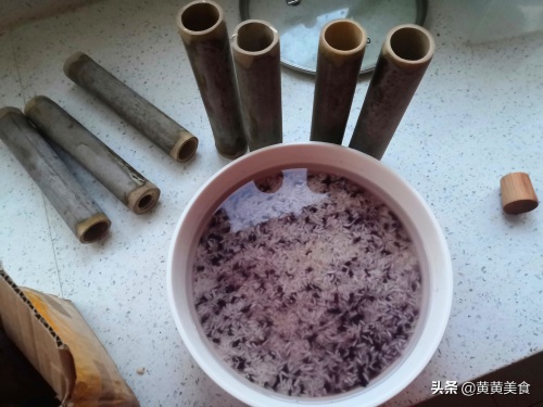 糯米和紫米按照10:1的比例混合洗干净浸泡4小时,我第一次做没什么经验,用了一斤糯米和一两的紫米,发现泡好米太多了。我把米分成了三份,取其中的一份做了七个竹筒粽子,2块钱的糯米够全家人吃啦。