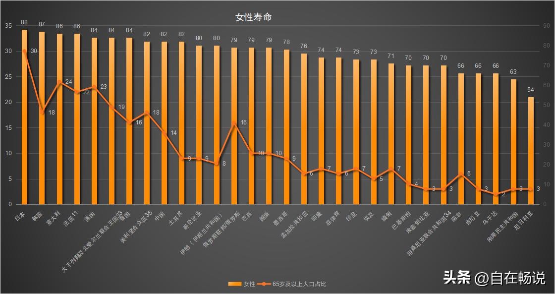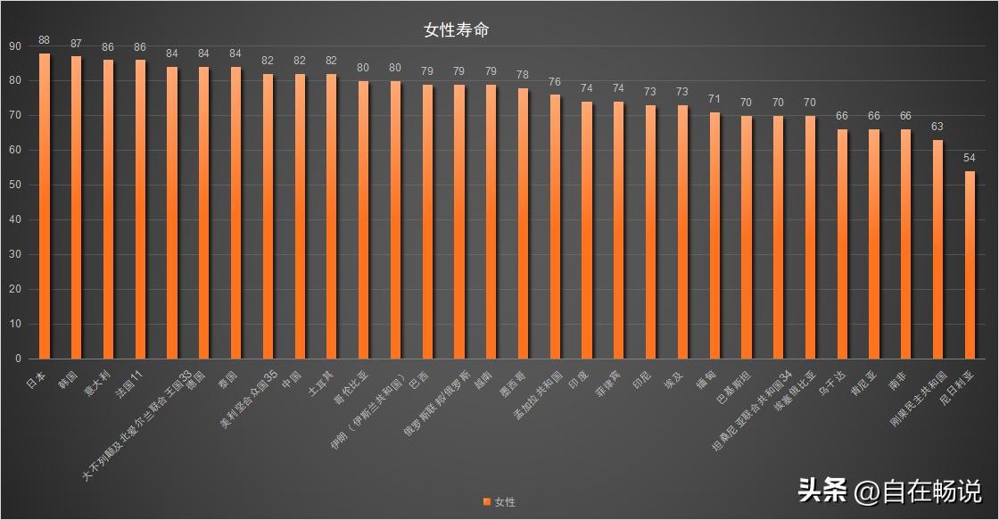 全球人口数量前三十国家或地区女性寿命排名