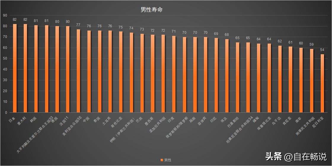 全球人口数量前三十国家或地区男性寿命排名