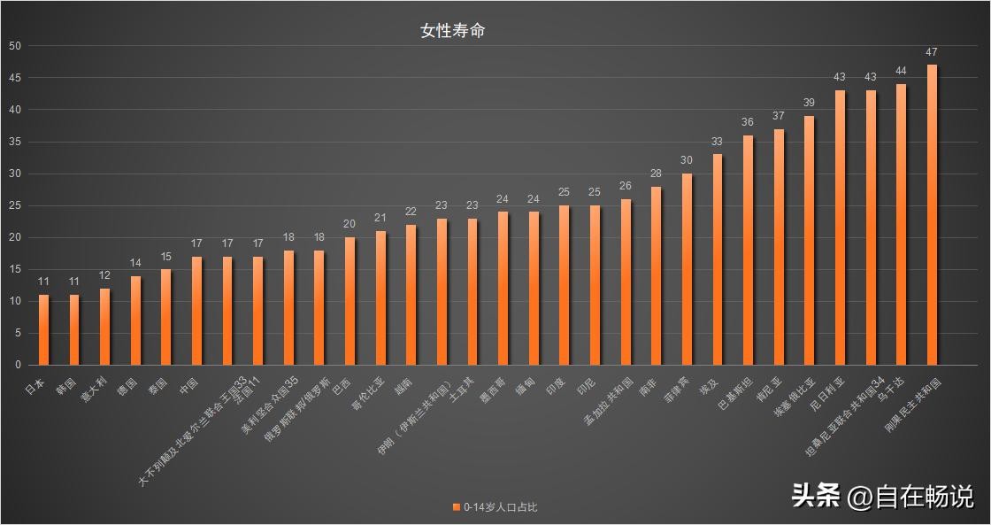 全球人口数量前三十国家或地区0-14岁人口占比排名