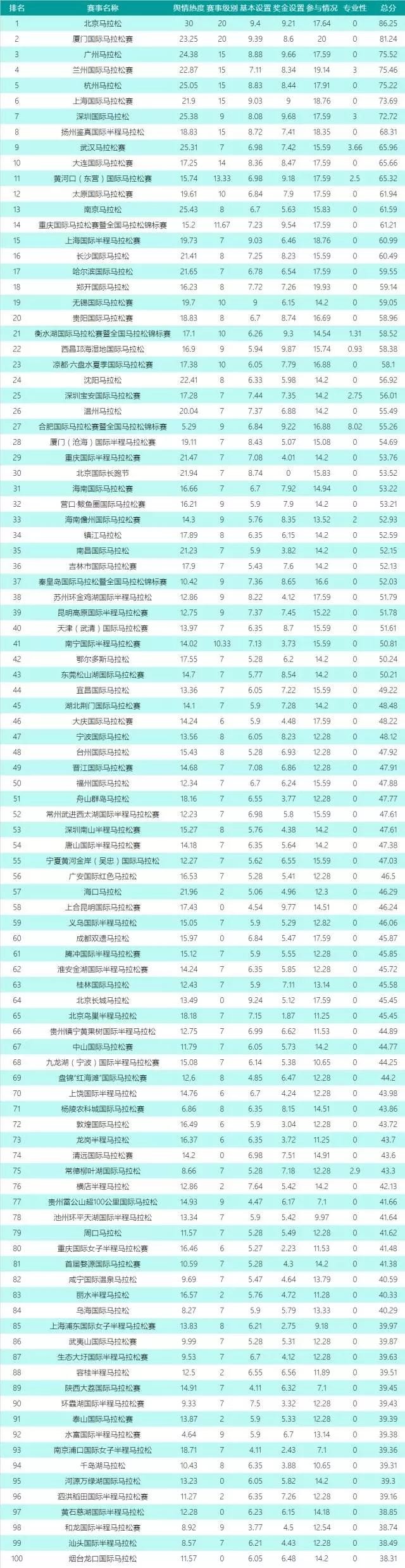 公众认可度主要以各大赛事信息在网络媒体及网络用户中所产生的情感正负导向以及赛事的公众参与情况为计算依据,评估媒体及网民对于马拉松赛事的认可度。各位,你满意这个排行榜吗?说说你最喜欢哪一场呢?