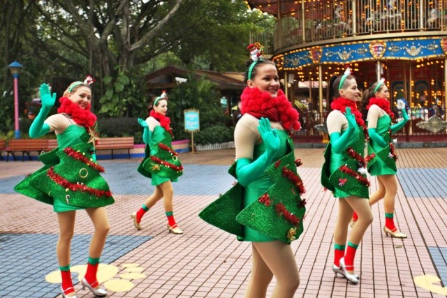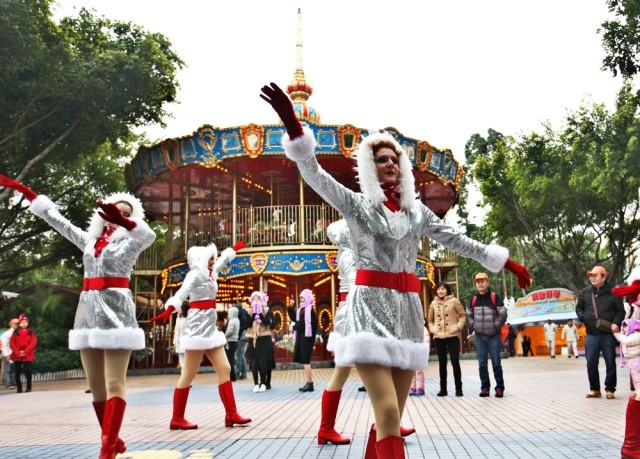 身穿红绿色调裙子的妙龄女郎款款而过,送上中外合璧的新年祝福!