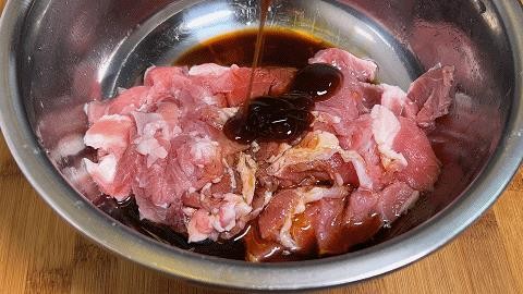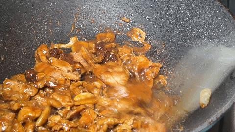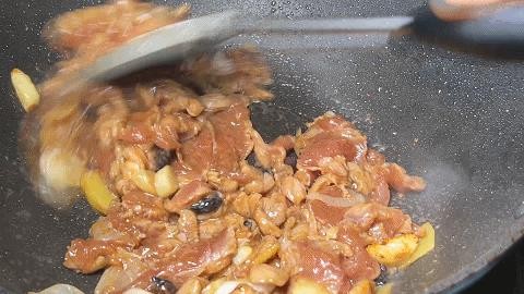 4、 加入一勺黄豆酱炒出酱香味,肉片炒至变色即可,这样更嫩滑