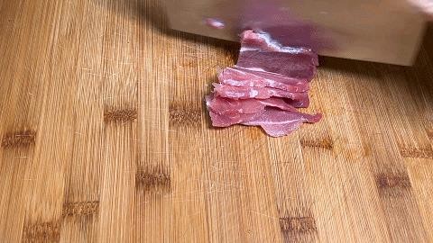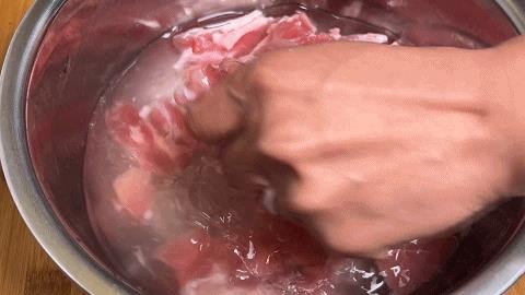 4. 里脊肉为了好切,先在冰箱里冷藏一下,切成薄片放在盆中用清水清洗干净