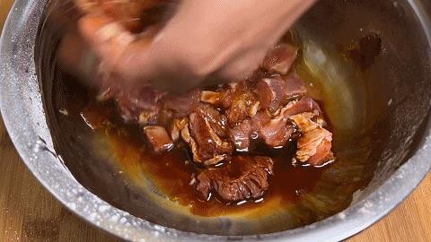 2、 里脊肉切成薄片,加入生抽,蚝油,胡椒粉和淀粉用手抓匀,腌制10分钟