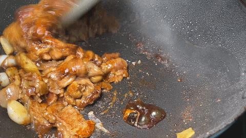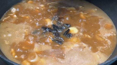 17. 下入泡发好的木耳盖上锅盖煮5分钟,再下入葱段