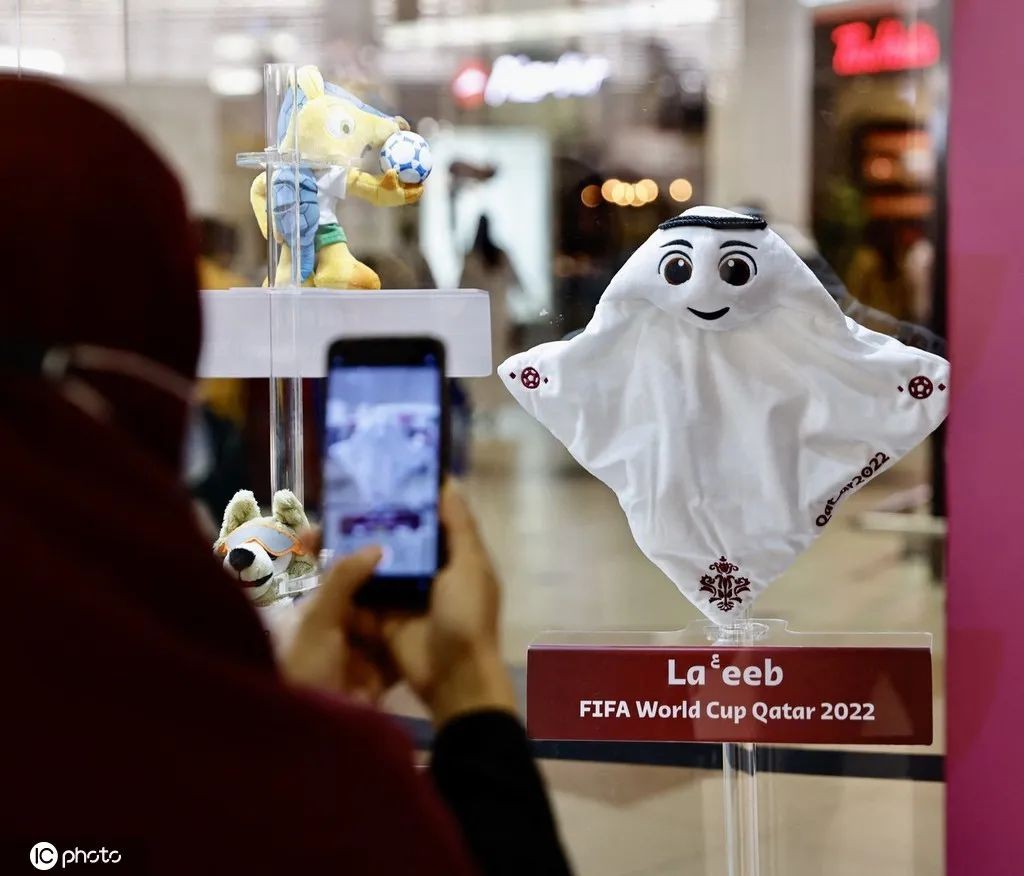 当地时间2022年10月24日,卡塔尔多哈,2022卡塔尔世界杯前瞻,历届世界杯吉祥物玩偶在多哈购物中心展出。