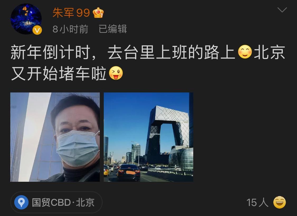 朱军在一条微博中写道:新年倒计时,去台里上班的路上,北京将再次出现交通堵塞。”