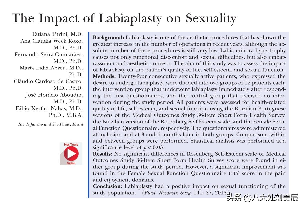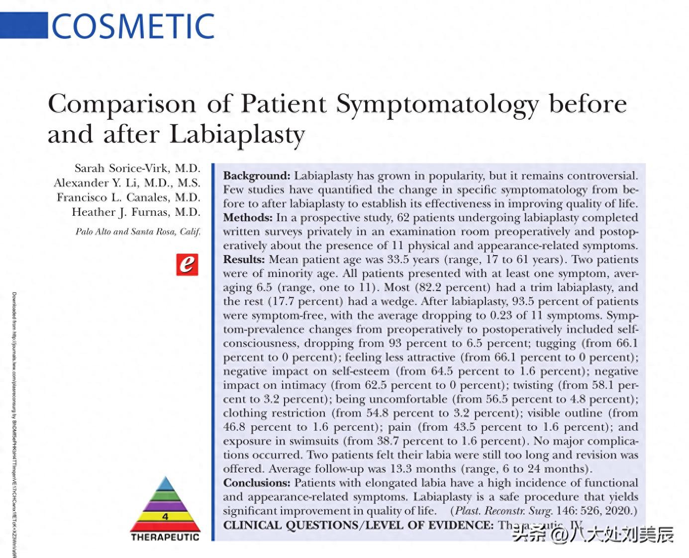 尽管存在争议,但数据显示,阴唇整形手术总体并发症低,满意度高。小阴唇成形术提高了患者的自信心,满意率高(>90%)。许多研究已经评估了阴唇成形术的安全性和有效性。一项研究(图一)指出,93.5%的患者在阴唇成形术后症状消失,自我意识、牵拉不适、衣着限制、对亲密关系的负面影响都有所改善。另一项研究(图二)评估了小阴唇成形术对性行为的影响,发现阴唇成形术改善了患者性生活的质量。大多数研究报告并发症发生率低。