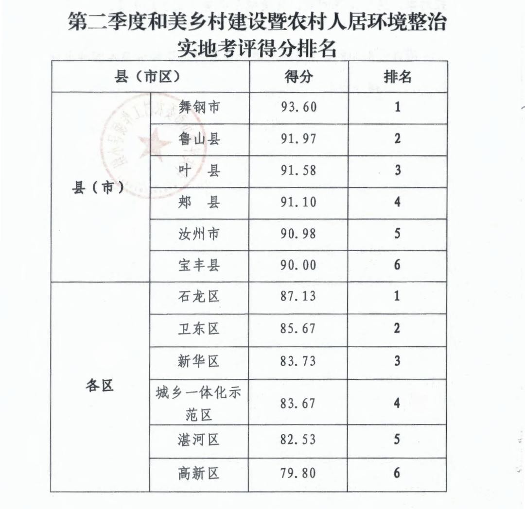 9月5日,平顶山市委农村工作领导小组办公室印发的第二季度和美乡村建设暨农村人居环境整治实地考评得分排名显示,舞钢市以93.60分的得分稳居各县(市)第一名,这也是该市继第一季度获得第一名后再次蝉联考评得分榜榜首。