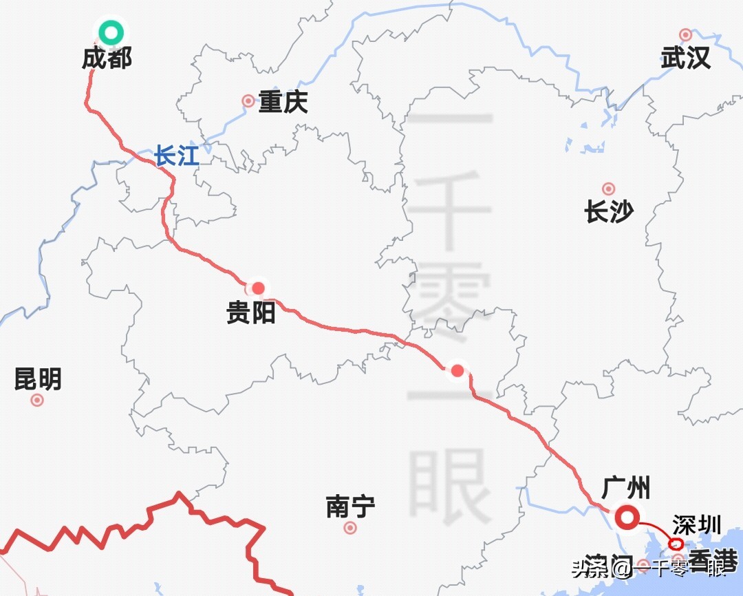 最理想的路线自然是这样的:从成都东站或者成都南站始发,一路沿着成贵高铁南下,到达贵阳后,上贵广铁路,停靠广州后再上广深高铁,最终抵达深圳北站。距离长度1650公里左右,时间大约在10个小时上下。