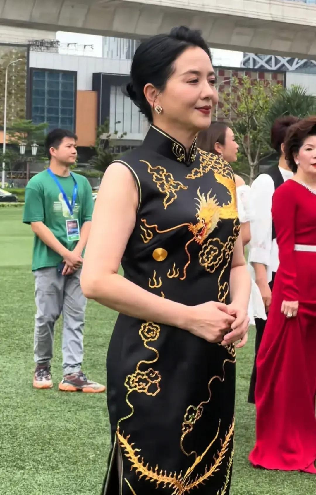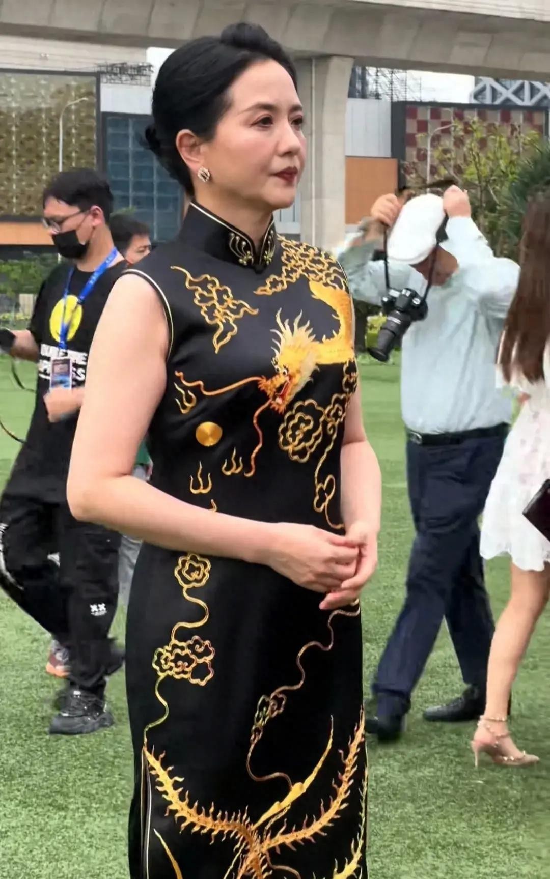 她身着一袭镶有金龙纹的黑色旗袍,尽显高贵气质,仿佛黑夜中的一颗璀璨明星,闪烁着无与伦比的光芒。