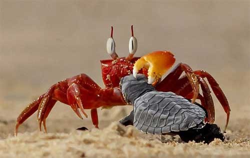 蟹老板这突出的长眼睛和红外壳推测他是沙蟹。