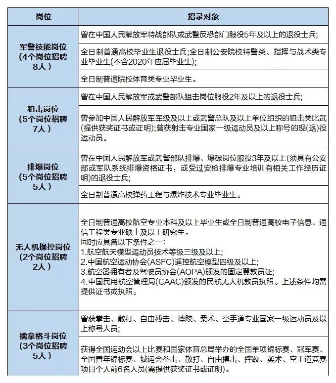 从擒拿格斗岗位来看,定向招录的群体还有相关专业的国际一级运动员或获得过比赛奖项和证书的运动员。