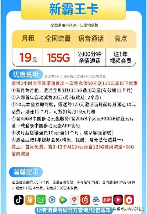 让我们来了解一下这个套餐的具体内容。该套餐包含155G流量,其中包含100G通用流量和55G定向流量,可以满足用户日常的上网需求。此外,该套餐还包含了300分钟的通话时长和10条短信。从这些内容来看,这个套餐的性价比还是比较高的。