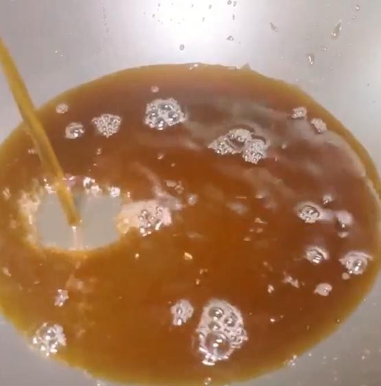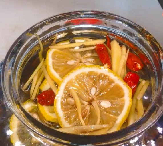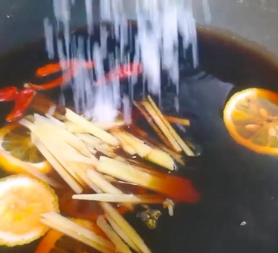 第四步:锅中加入姜丝和柠檬片,干辣椒,花椒去腥,再加入150克白糖,(不喜欢甜的加入盐也可以)搅拌均匀放凉备用