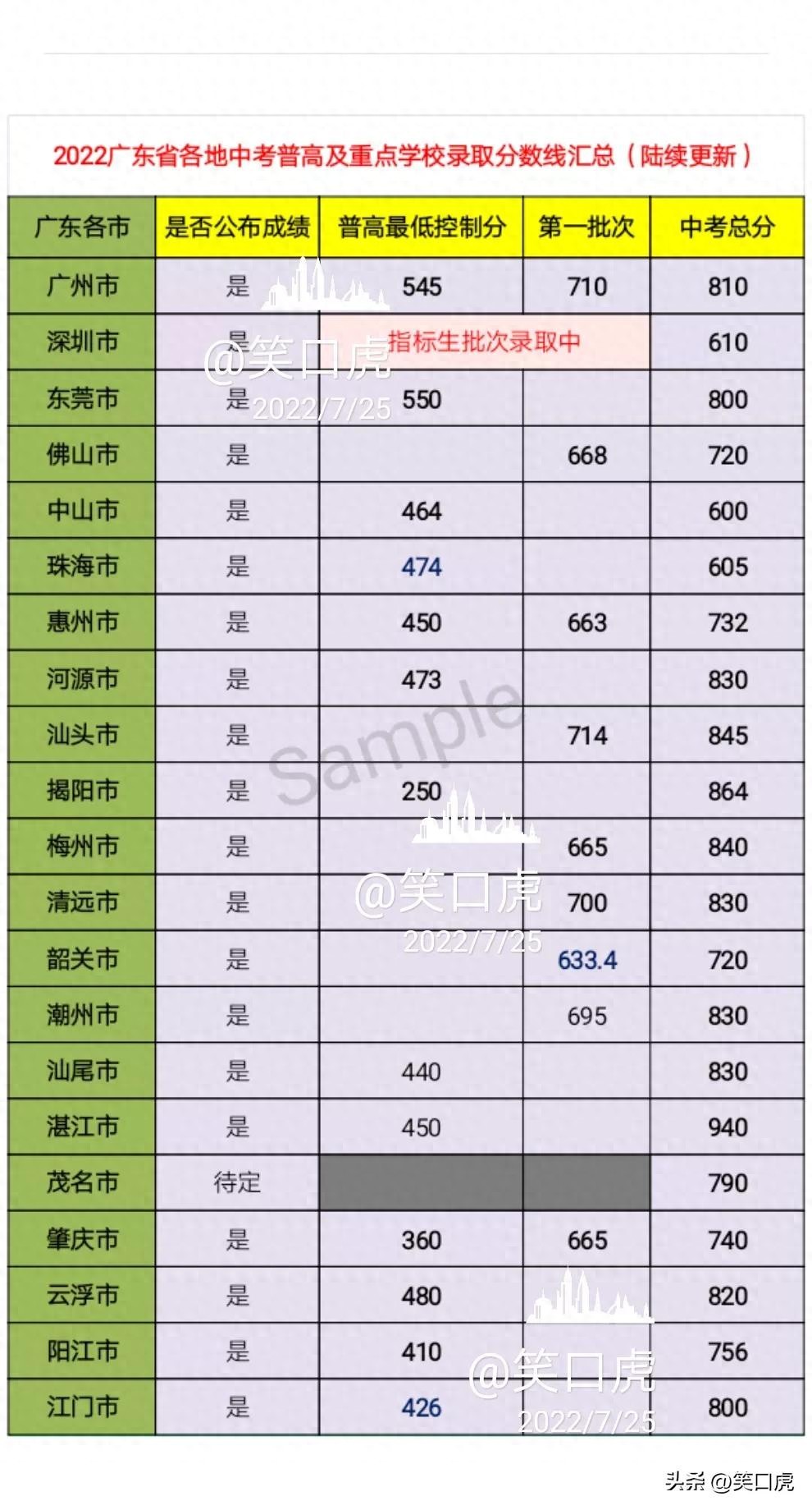 截止7月25日,广东省内中考成绩仅茂名地区还在等官方公布,湛江已公布普通高中各批次录取分数线,深圳明天公布正取生第一批次录取分数线,更多敬请期待后面的更新!