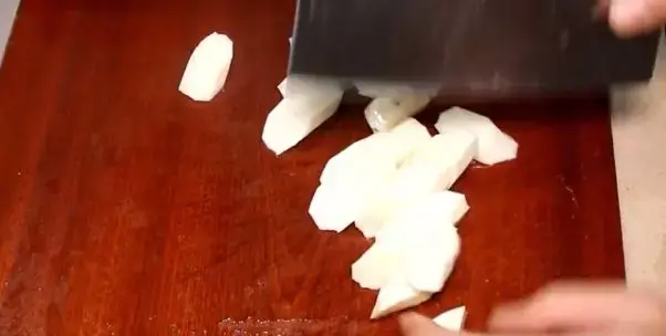 3.然后开始准备辅材,山药去皮洗干净,斜刀切段备用;