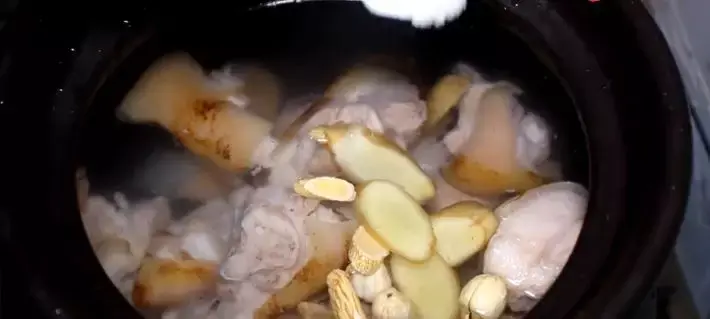 6.洗好后倒入砂锅里,加入清水,黄芪,白莲子,白芷,姜片,一小勺食盐大火烧开;
