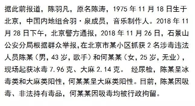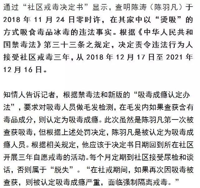 陈羽凡吸毒成瘾,被警方责令戒毒3年